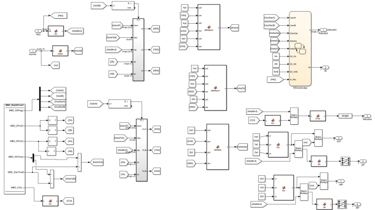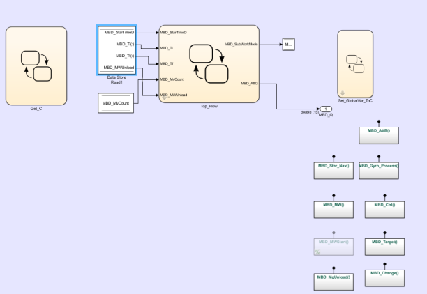 對頂層工作流程、外部變量交互進行建模,將各個子功能模型作為Simulink Function進行調(diào)用,如下圖所示。模型設(shè)計在架構(gòu)建?;A(chǔ)上形成工作流調(diào)用模型,主要負責將上述功能模塊按時序和邏輯調(diào)用。