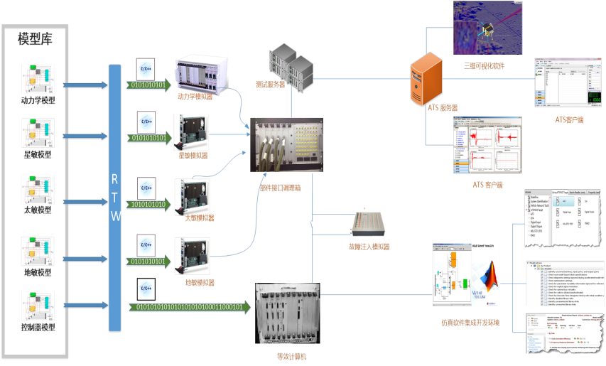 3、經(jīng)過全數(shù)字仿真驗證后的模型,使用自動代碼生成技術(shù),加載到衛(wèi)星控制計算機中,進行半實物閉環(huán)測試,完成硬件在環(huán)測試;